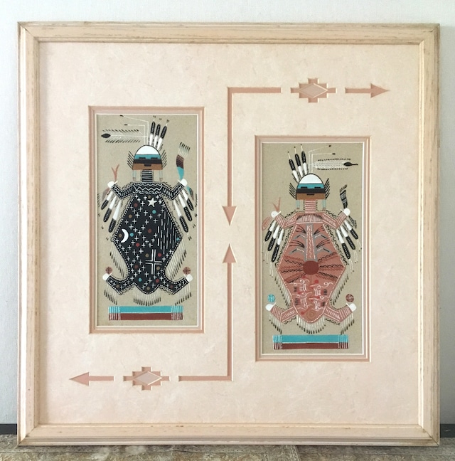 -     【アメリカインディアン】ナバホ族のサンドペインティング【No.2】 ¥53,000 アリゾナ州の最大の観光スポットとして、日本人にも大人気のアンテロープ・キャニオン。 この地で暮らすインディアン・ナバホ族のサンドペインティング(砂絵)です。 もともとは、儀式の際にメディスンマン(祈祷師)が描いていた砂絵。ナバホの神話にもとづいた聖なる山や人、穀物や動物など、様々なモチーフが描かれています。砂絵は精霊が降臨する場所と考えられ、儀式後には消されてしまうものでした。 それを、1940年代頃から、永続的に残すための工夫が施され、芸術作品として親しまれるようになっています。 全作品に、ハンドメイドの額が装着されています。 【神話の世界】 ナバホ族には、世界の始まりを表す創世神話があり、口伝によって継承されてきました。一人の男と女が誕生するところから始まり、第一の世界から順を追って、現在の世界へたどり着きます。特に重要な動物として、コヨーテが登場します。彼らは賢く、強く、悪知恵の働く存在。砂絵にも、度々コヨーテが描かれています。 【聖なるモチーフ】 砂絵には太陽や大地、植物など、ナバホ族にとって大切なモチーフが描かれています。もっとも象徴的なのは、YEI(イェイ)と呼ばれる、人間と神の中間のような存在。すべてのものと調和し、生きていく術を教えてくれます。 【自然素材のアート】 ナバホ族のサンドペインティングは、自然に存在する材料だけを使って描かれます。近くで見ると、盛り上がった砂の重なりに見惚れてしまいます。細かな粒の集合体が描く、神秘の世界をぜひ間近でご覧ください。 こちらは、店主が約40年前買い付けたものになります。 【商品名】ナバホ族のサンドペインティングN0.2 【製作年代】1980年代頃 【サイズ】 高さ約58cm、幅約58cm(額込) 【生産国】アメリカ