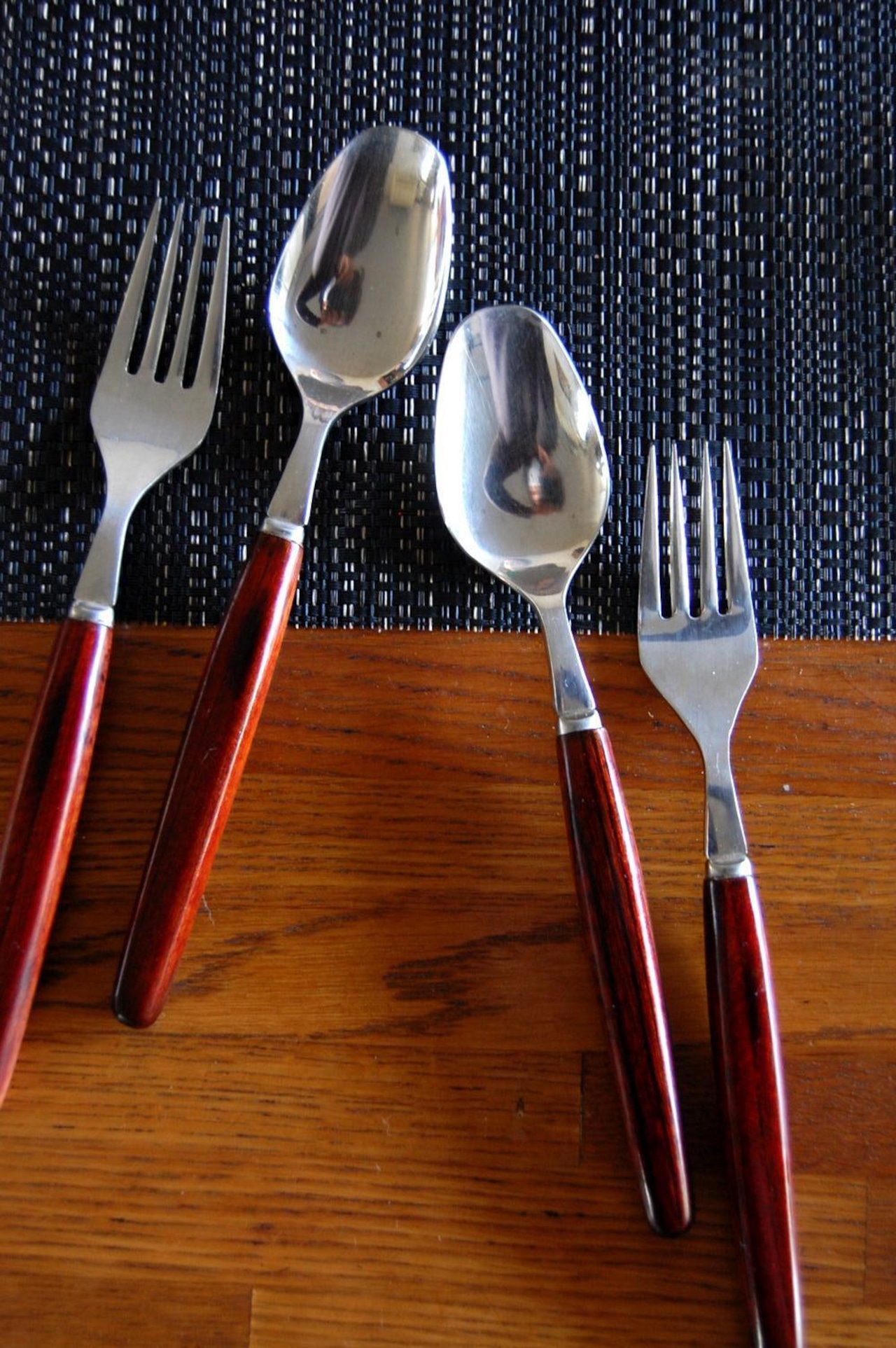 ローズウッドの持ち手がついた、ステンレス製のディナースフォーク5本セットになります。