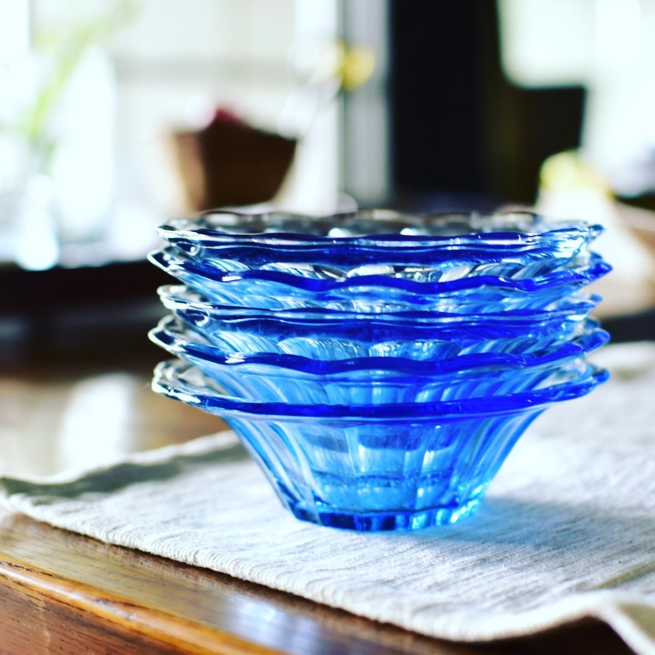 手作業で型にはめて製作したプレスガラス のデザート皿5枚セットです。